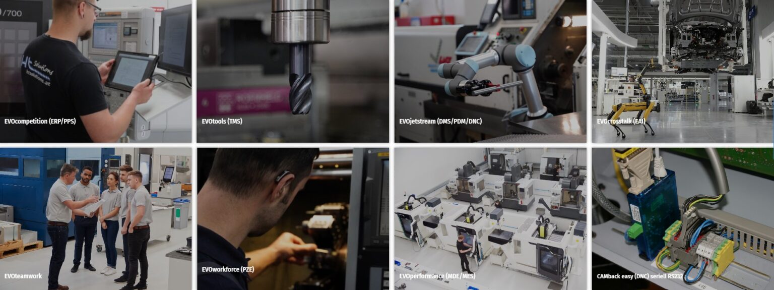 EVO は、人材管理、文書管理、生産計画、製品データ管理、機械監視および生産データ収集に至るまで、企業の業務プロセスを包括的にデジタル化するための統合ソフトウェアパッケージの開発に注力しています。これらのソリューションは相互に連携し、製造業における効率化と可視化を実現します。代表的な製品には以下が含まれます: